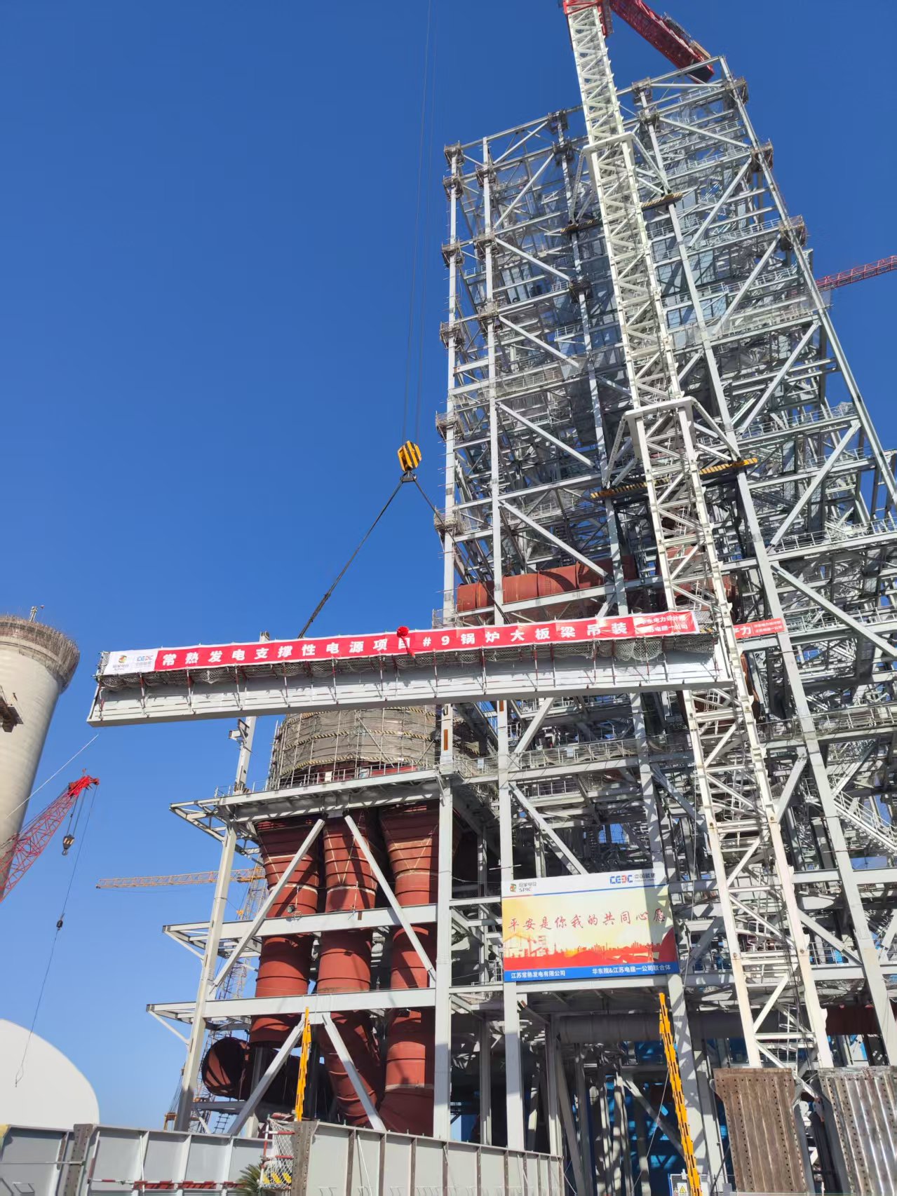11月29日,監理公司參建的中電常熟3×660兆瓦機組擴建項目9號機組鍋爐首根大板梁順利完成吊裝,標志著本項目設備安裝又進入一個重要工序節點,為后續鍋爐受熱面安裝及整體項目的穩步推進筑牢了堅實的基礎。 中電常熟3×660兆瓦機組擴建項目9號鍋爐大板梁頂標高為106.3米,在鋼架K2、K3位置布置大板梁兩根,大板梁截面全高為6570毫米,其中上部截面高度為3820毫米,下部截面高度為2750毫米,下梁分前后兩件,上梁分左、中、右三件,共計81件(板梁10件、次梁67件、端板4件、下板梁間連接梁18件)總重量約為1028.03噸。 本次吊裝的是K2下板梁,鍋爐大板梁作為鍋爐系統的核心承重部件,其結構復雜,重量巨大,對施工精度和安全性要求極高。為確保大板梁吊裝節點目標按期實現,項目自鋼架吊裝以來,上海電力監理咨詢有限公司常熟項目監理部組織業主、華東設計院、江蘇電建一公司對大板梁吊裝專項方案評審,對大板梁到場后制造質量進行全面檢查和復查。 開始作業前,監理項目部安裝與安全監理工程師們全程參與,現場進行詳細安全技術交底,并對吊裝機械、作業人員資格、起重索具、高空作業措施進行檢查確認,對吊裝方案實際落實和執行情況進行周密全面逐一排查,確保了安全、質量、進度等目標順利實現。 該項目于2023年取得江蘇省發改委核準批復后就列為了江蘇省重點電力建設項目,建成后將為江蘇省電網提供穩定電力支撐,對于促進當地經濟社會高質量發展具有重要意義。 后續,監理公司常熟項目監理部將團結一心,奮力拼搏,實現中電常熟3×660兆瓦機組擴建項目“高標準達標投產,爭創國家優質工程”的總體目標,為項目建設書寫更加絢麗的新篇章! |